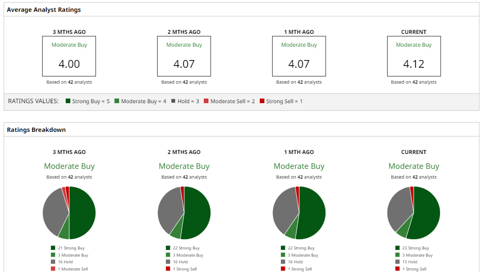 Overall, 42 analysts on average rate AAPL stock as a “Moderate Buy.” The consensus 12‑month price target is $296.30, which implies 8% potential upside. Meanwhile, the Street-high $350 target implies 28% potential upside from here.