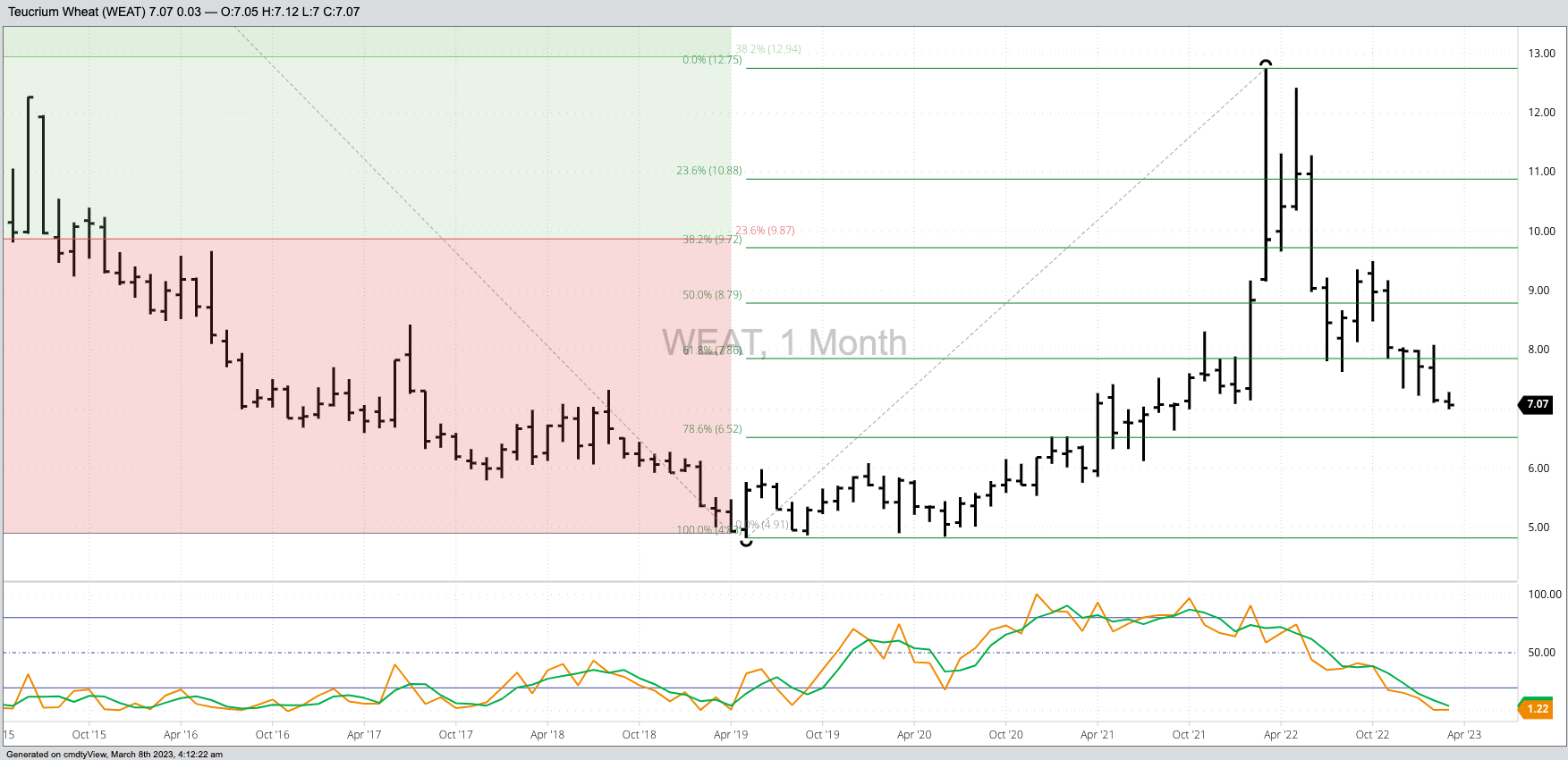 Many investors don’t want to trade cash wheat though, and understandably so. Another avenue is exchange-traded funds (ETFs), with one I track in my newsletter being Teucrium’s Wheat Fund (WEAT). Here we see a similar technical pattern to the SWPI, with the most recent difference being WEAT has posted a new low of $7.00 during March so far. Is the fund oversold? Yes. Has it given us a confirmation to buy? No, but it could by the end of the month if it is able to complete a bullish reversal pattern.Â