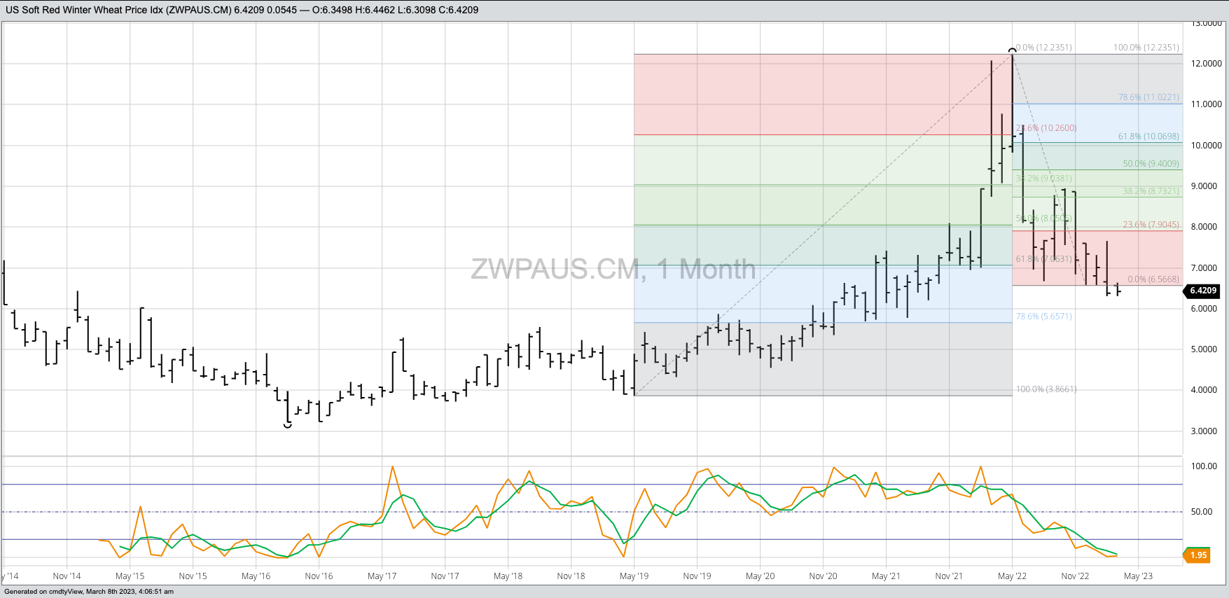 Which leads us to Newsom’s Market Rule #1[iv], and by association Newton’s First Law of Motion applied to markets: A trending market will stay in that trend until acted upon by an outside force, with that outside force usually noncommercial activity. As I’ve been talking about in my monthly newsletter for market investors, the Barchart National SRW Wheat Price Index (ZWPAUS.CM) has been in a major (long-term) 3-wave downtrend since posting a spike high during May 2022. However, the SWPI took out the Wave A (first wave) low of $6.6755 (August 2022) last December and extended the downtrend to $6.3052 during February. This has pulled monthly stochastics (long-term momentum indicator) into single digits, well below the oversold level of 20% and in position for a possible bullish crossover.