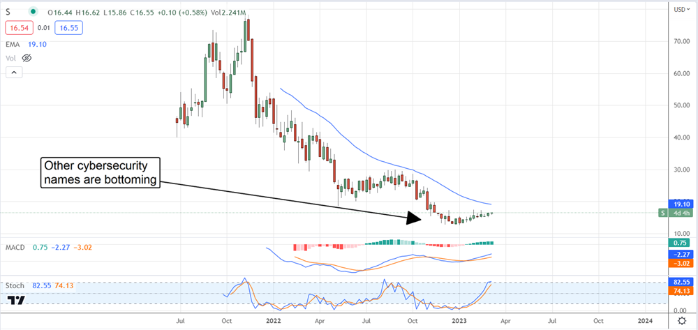 SentinelOne (NASDAQ: S) has been trending lower from the post-IPO peak on fear of slowing growth compounded by fear of slowing in the cybersecurity industry. Names from Zscaler (NASDAQ: ZS) to Palo Alto Networks (NASDAQ: PANW) have been under pressure for the same reasons, and they’ve all reported OK if not good results and outlook. This has the group bottoming, and SentinelOne should be included despite the recent trend in analyst sentiment.