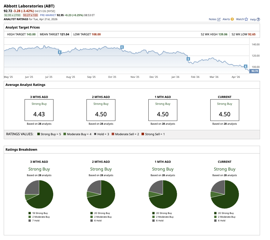 Overall, analysts have rated ABT stock a “Strong Buy.” Out of 28 analysts covering the stock, 20 have a “Strong Buy” rating, two have a “Moderate Buy” rating, and six have a “Hold” rating. ABT stock is down 25.4% year-to-date (YTD), compared to the broader market. But analysts expect the stock to climb 30.5% from current levels based on its average target price of $121.04. Plus, the high price estimate of $143 implies potential upside of 54.2% over the next 12 months.
