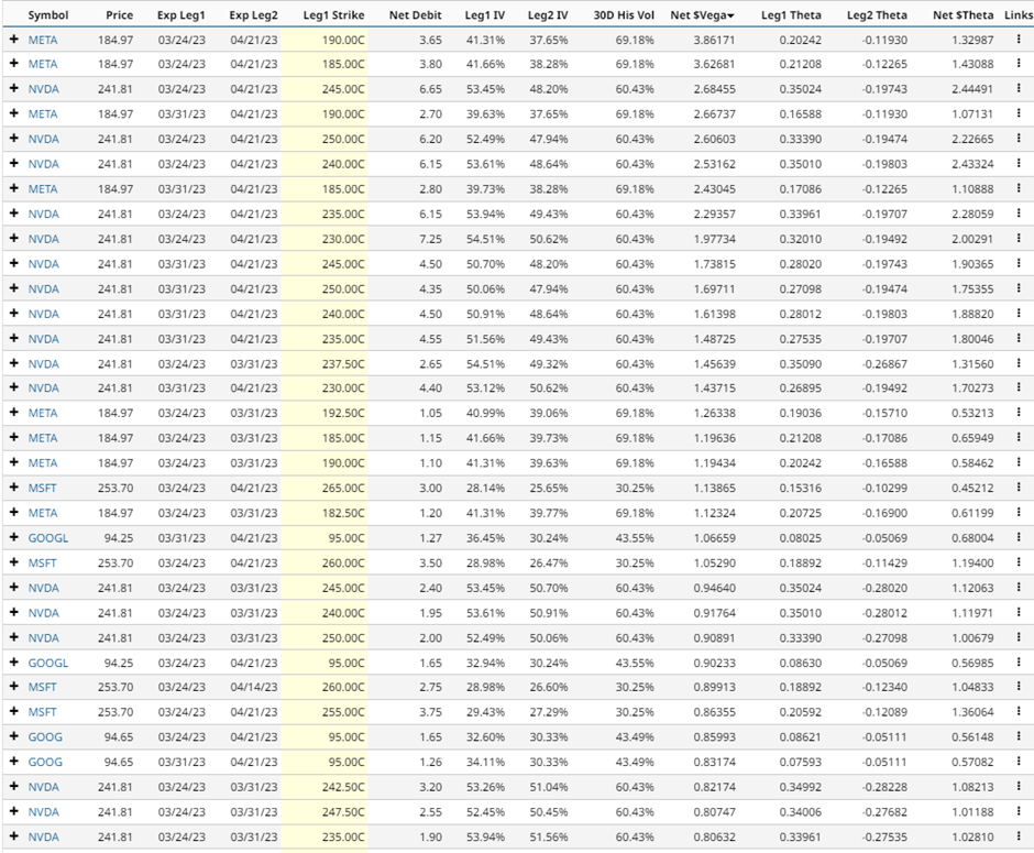 The screener shows some interesting calendar spread trades on popular stocks such as META, NVDA, GOOGL and NVDA. Let’s walk through a couple of examples.