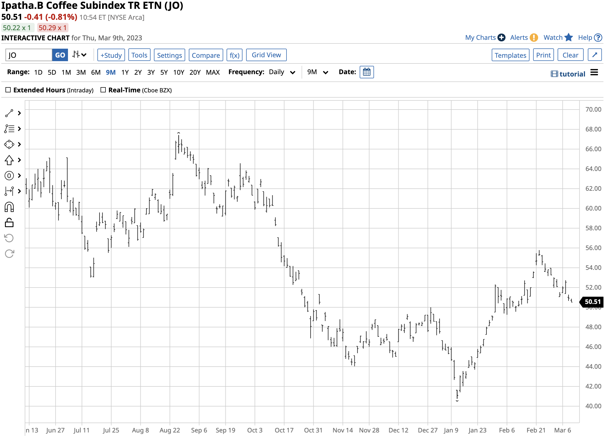 At $50.51 per share on March 9, JO had $126.786 million in assets. JO trades an average of 25,207 shares daily and charges a 0.45% management fee. Nearby ICE Arabica coffee futures rose from $1.4205 in January 2023 to $1.7415 on March 9, or 22.6%.