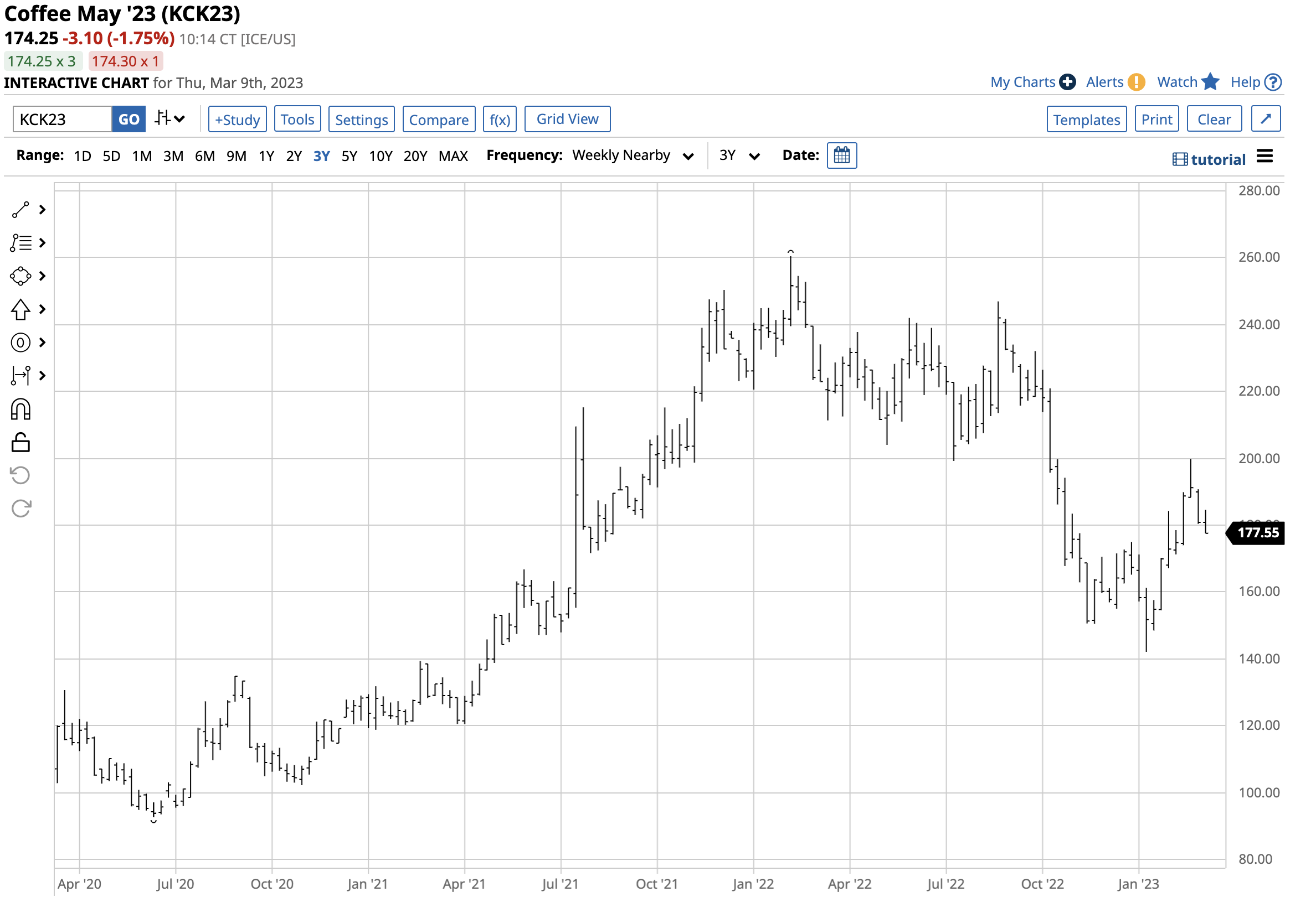 The weekly chart highlights the bounce in the coffee futures market that took the price over the $1.75 level in early March 2023.
