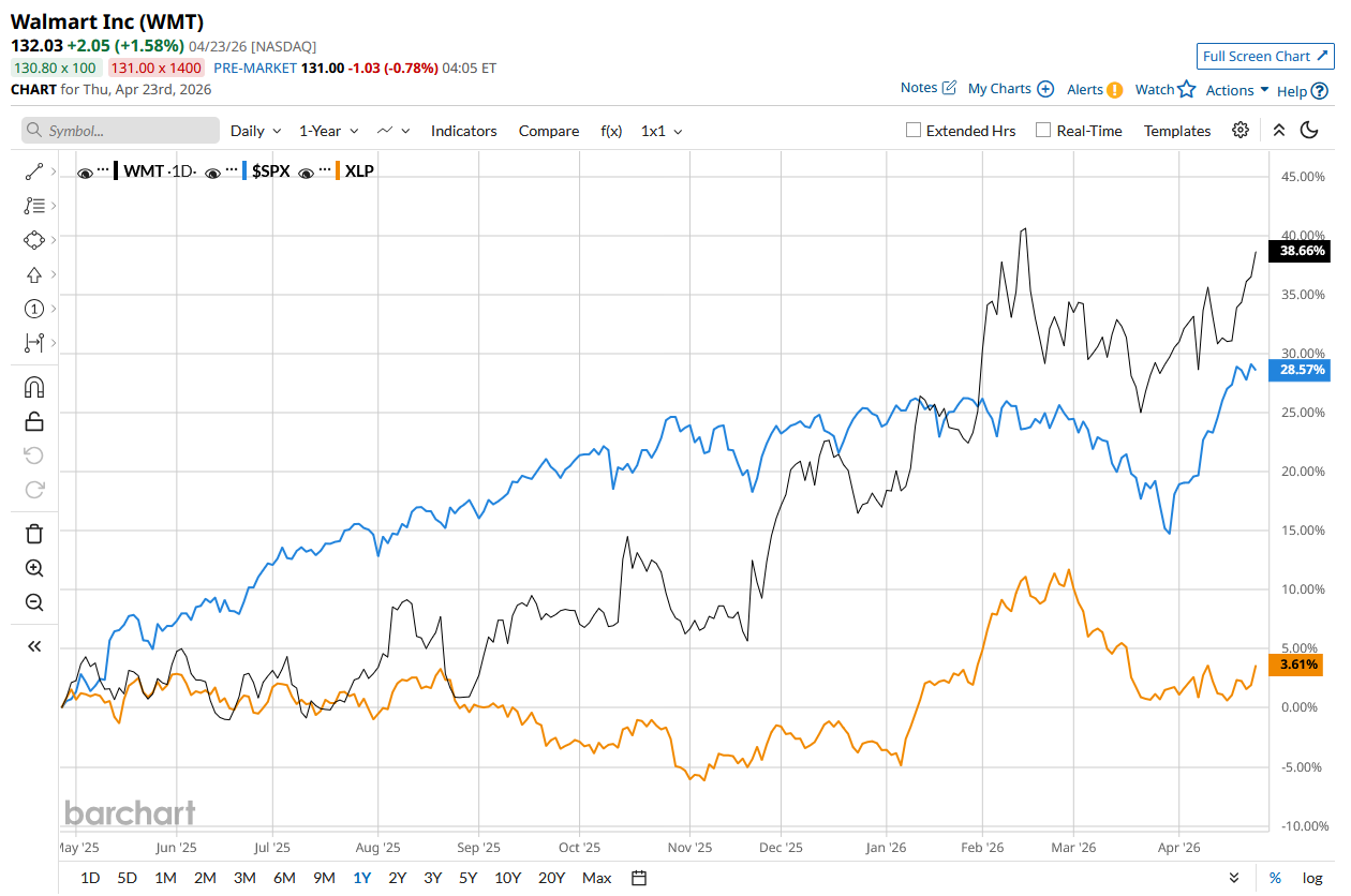 WMT stock has surged 39% over the past 52 weeks, outperforming the S&P 500 Index’s ($SPX) 32.2% rise and the State Street Consumer Staples Select Sector SPDR ETF’s (XLP) 2.1% rise during the same time frame.