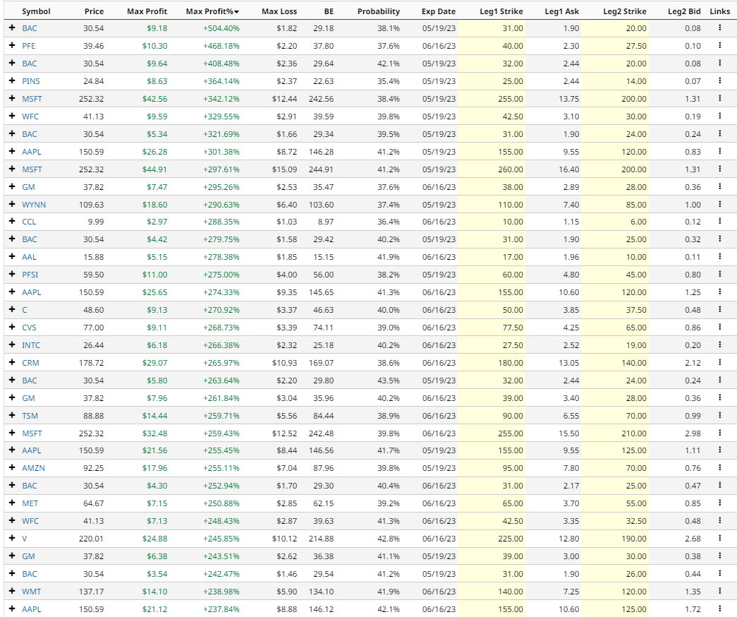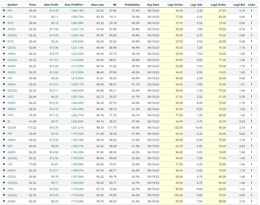 Let’s take a look at Barchart’s Short Bear Put Spread Screener for today: