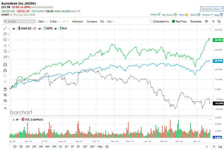 Over the past year, ADSK stock has dipped 12.3%, notably underperforming the S&P 500 Index’s ($SPX) 32.2% gains and the Technology Select Sector SPDR Fund’s (XLK) 57.4% gains over the same time frame.