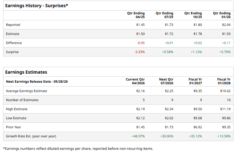 The software titan is expected to announce its fiscal first-quarter earnings for 2027 in the near term. Ahead of the event, analysts expect ADSK to report a profit of $2.16 per share on a diluted basis, up 49% from $1.45 per share in the year-ago quarter. The company beat the consensus estimates in three of the last four quarters while missing the forecast on another occasion.