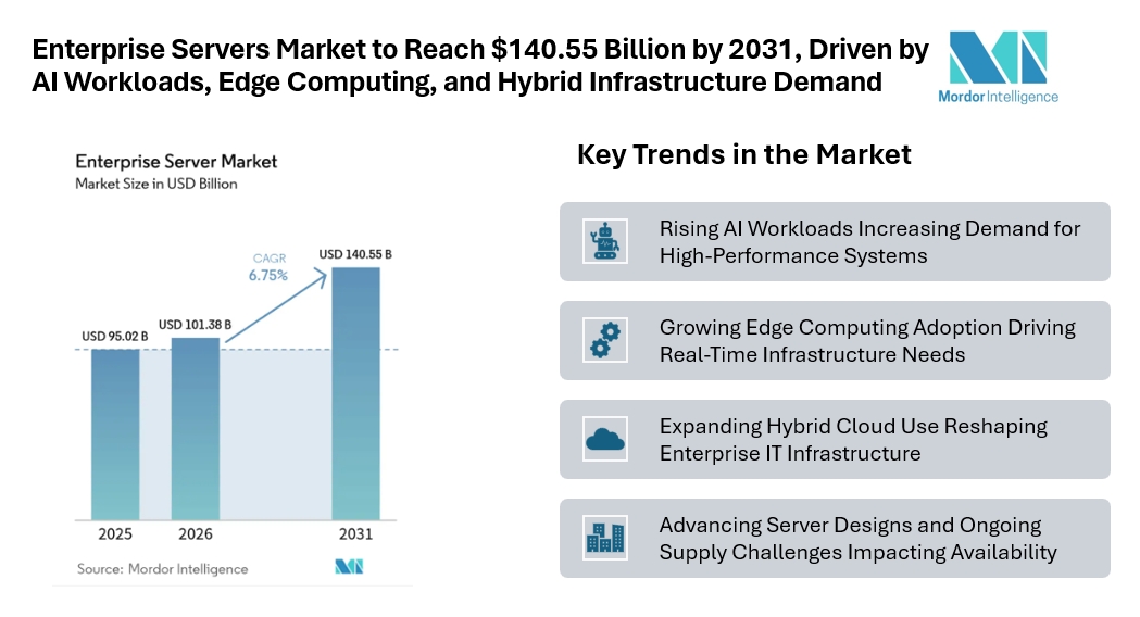 According to Mordor Intelligence, the enterprise servers market size is estimated at USD 95.02 billion in 2025 and is expected to reach USD 101.38 billion in 2026, eventually expanding to USD 140.55 billion by 2031, registering a CAGR of 6.75% during the forecast period. This market forecast reflects consistent demand across industries that depend on reliable and scalable data processing environments.