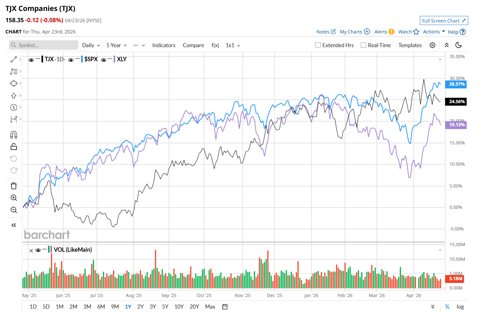 TJX has gained 26.2% over the past 52 weeks, underperforming the S&P 500 Index's ($SPX) 32.2% return over the same time frame. However, it has outpaced the State Street Consumer Discretionary Select Sector SPDR ETF’s (XLY) 23.7% uptick over the same time period.