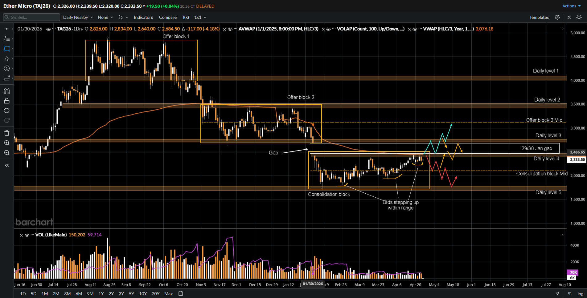 - Price then entered a sideways consolidation range between 3500 (daily level 2), and 2700(daily level 3), into late January 2026.