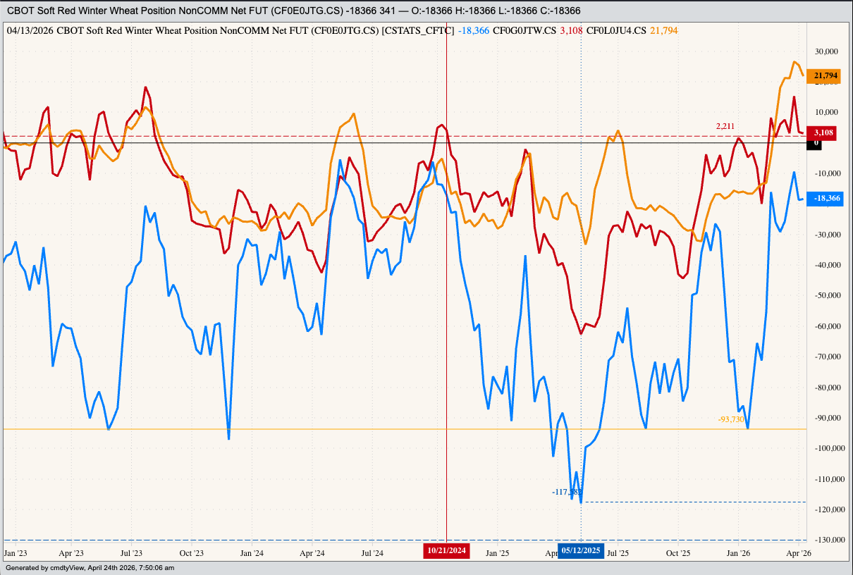 Those who don’t understand wheat, the noncommercial side looking to bring back the Wild West days of meme stocks, this time in commodities, have likely been adding to their net-long futures position. As mentioned, the previous Commitments of Traders report showed funds held a net-long futures position of 3,108 contracts, down from the recent high of 15,315 contracts the week of Tuesday, March 31. A look back to a year ago at this time and we see Watson (my name for the algorithm-driven noncommercial side) was on its way to a net-short futures position of 62,690 contracts the week of May 12, 2025. At the same time, total open interest in the HRW market was 262,000 contracts as compared to this past Thursday’s reported figure of 298,200 contracts. Doing the math: