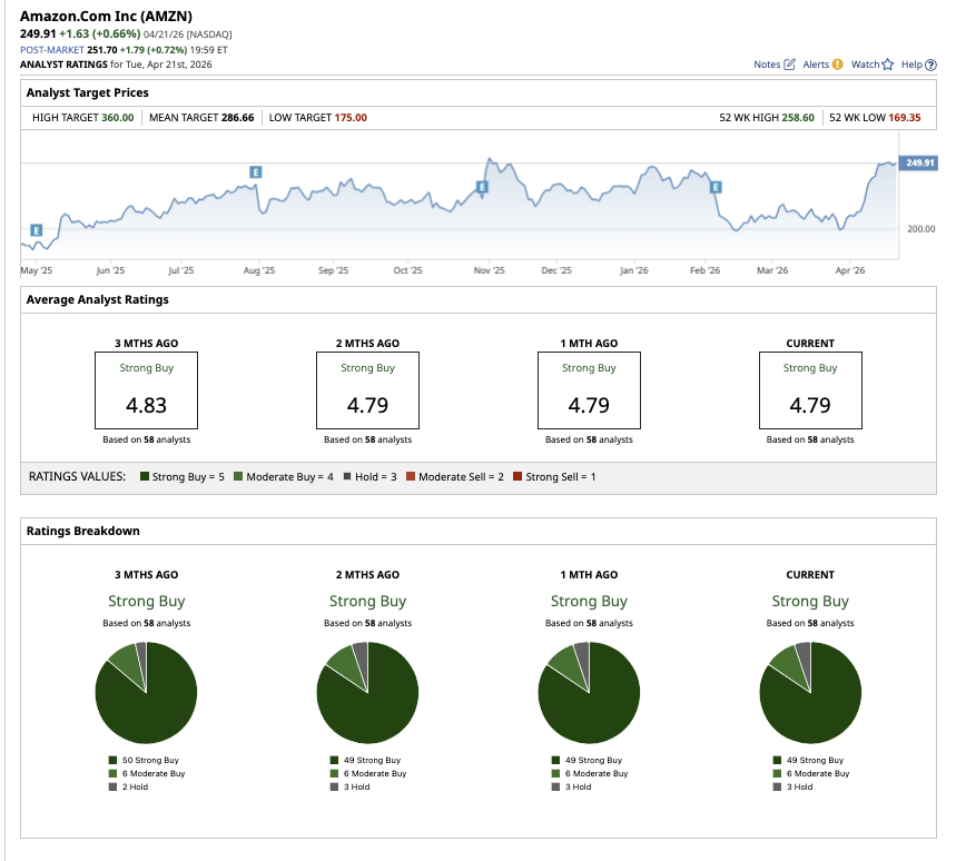 Amazon is set to report its Q1 earnings on April 29. Analysts predict revenue growth of 14% YOY to $177.1 billion, as well as an earnings increase of roughly 4% to $1.65 per share. For full-year 2026, revenue and earnings are expected to increase by 13% and 8%, respectively.