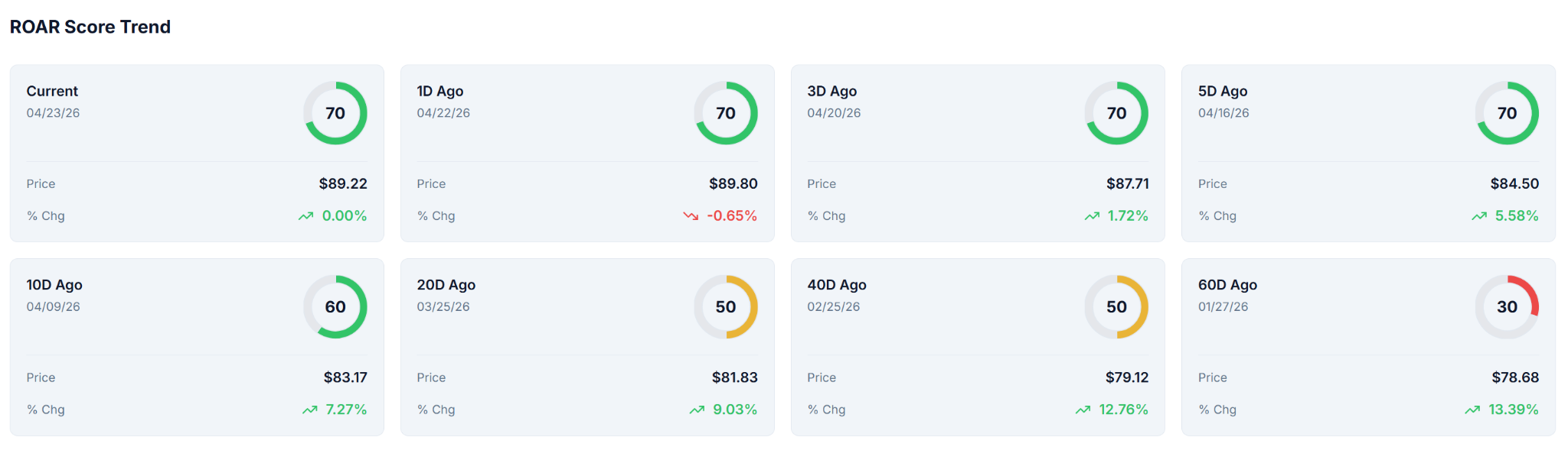 At a score of 30, CSCO at under $79 a few months ago was a “higher risk” proposition. ROAR is not about “buy/sell/hold.” It is about trying to assign a risk level at any point in the cycle. 30 does not mean no chance to appreciate. Only that the odds are a bit longer. But as the score gradually rises, the risk is perceived to be lower.