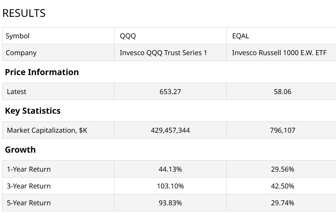 This shows just how out of favor the “average stock” has been for years. EQAL (EQAL) is the average of the 1,000 biggest stocks. It is trailing QQQ (QQQ) by double-digit percentage amounts over all three time frames shown.