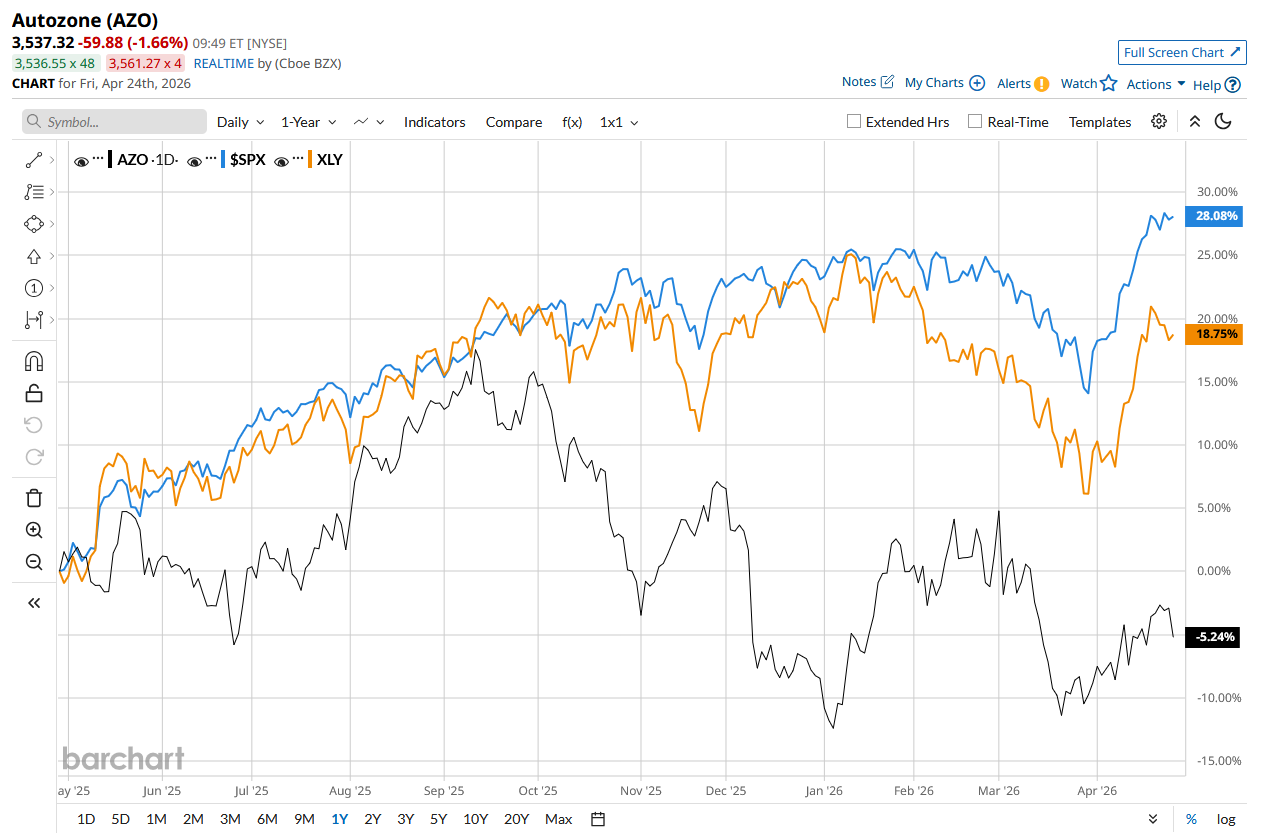 AZO stock has declined 2.4% over the past 52 weeks, underperforming the S&P 500 Index’s ($SPX) 29.9% rise and the State Street Consumer Discretionary Select Sector SPDR ETF’s (XLY) 21.9% return during the same time frame.