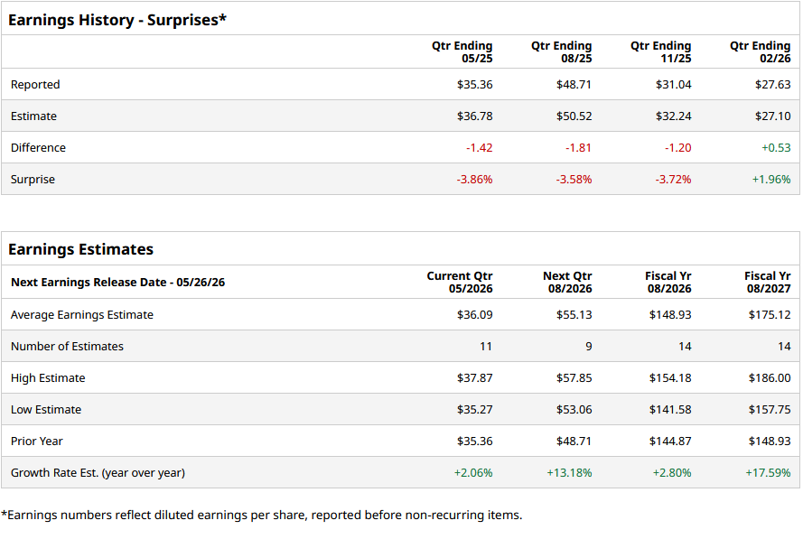 For fiscal 2026, analysts project the company’s EPS to be $148.93, up 2.8% from $144.87 in fiscal 2025. Moreover, its EPS is expected to rise by roughly 17.6% year over year (YoY) to $175.12 in fiscal 2027.