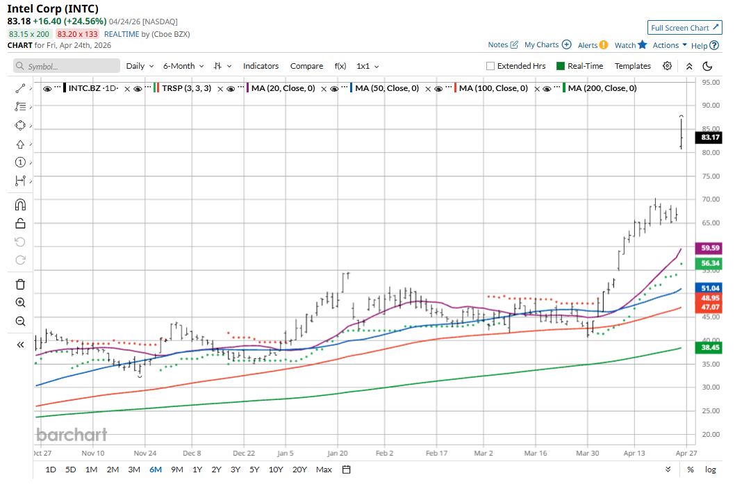 Intel (INTC) shares surged as much as 25% on Friday, April 24, pushing the stock above its dot-com high above $75 that had stood since August 2000.Â