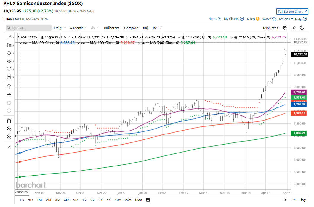 The broader semiconductor sector context adds both support and caution to the Intel story. The PHLX Semiconductor Index ($SOX) has posted a record 17-day winning streak with a 41% gain, the largest such move into a new high in the index’s history. Technical indicators are flashing extreme overbought conditions, with the SOX sitting more than 40% above its 200-day moving average, the widest gap since June 2000. Some market strategists are drawing explicit parallels to dot-com-era parabolic price action, warning that such moves historically resolve with sharp reversals.