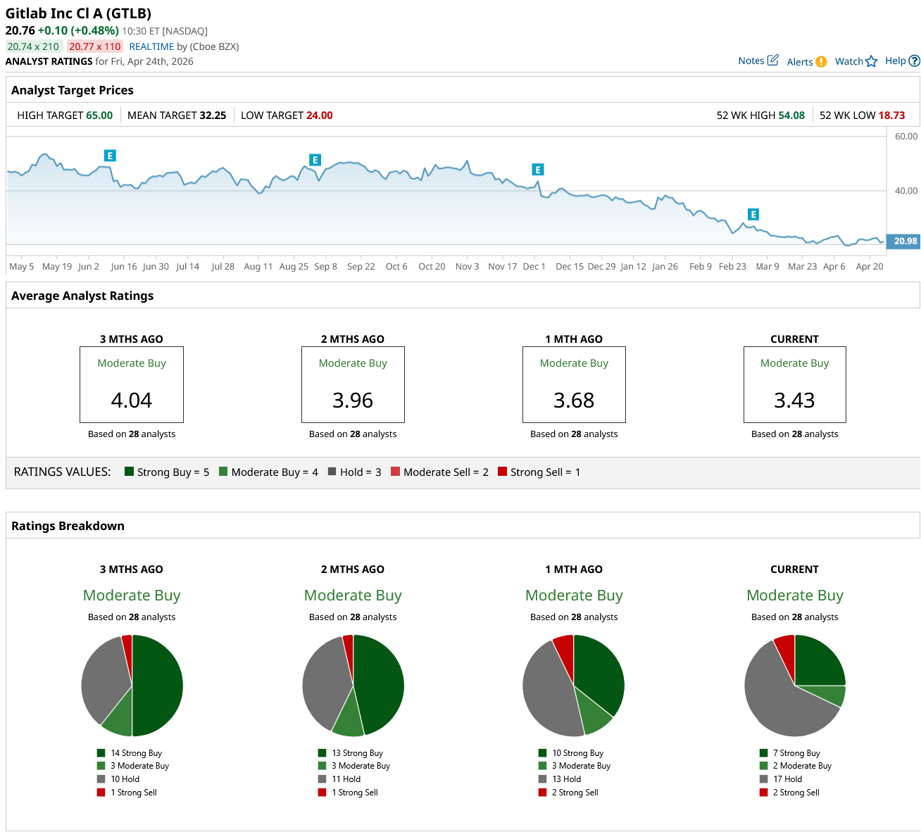 Out of the 28 analysts covering GTLB stock, seven recommend “Strong Buy,” two recommend “Moderate Buy,” 17 recommend “Hold,” and two recommend “Strong Sell.” The average GitLab stock price target is $32.25, indicating 60% upside from current levels.
