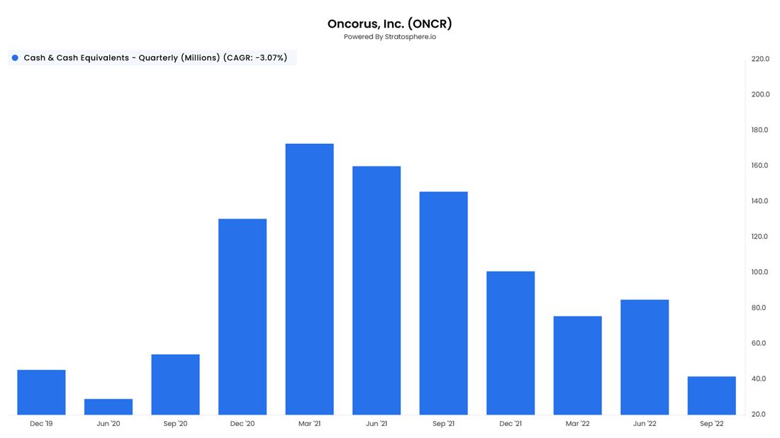 Oncorus is a pre-approval biotech firm, meaning they have no drugs to sell until they get FDA approval. This means borrowing money and issuing stock is the business's lifeblood. So any significant hit to its cash holdings means it cannot be regenerated without outside investment.