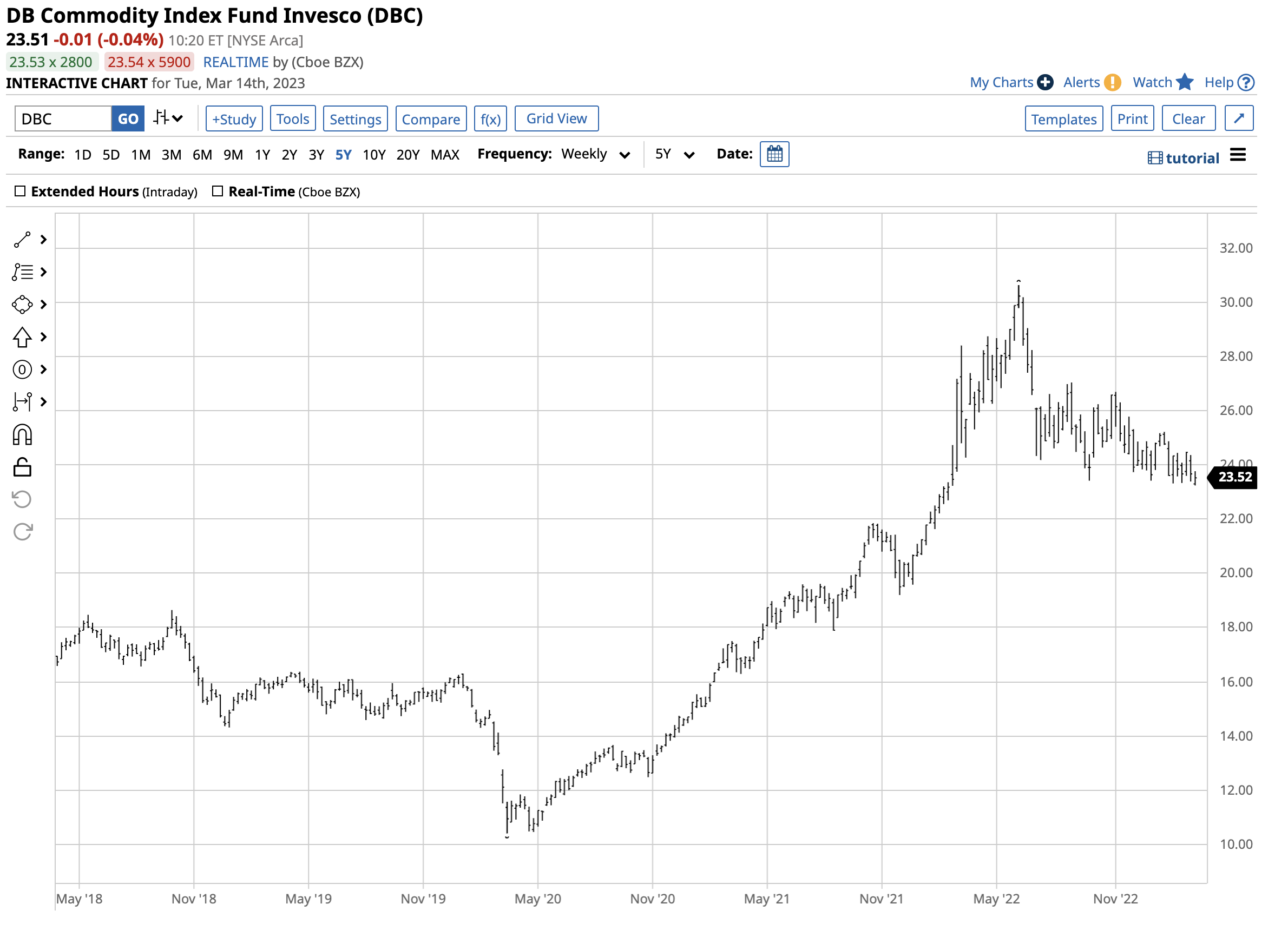 The Invesco DB Commodity Fund (DBC) is a liquid commodity ETF with a weighting towards traditional energy products. At $23.51 on March 14, DBC had $2.408 billion in assets under management. DBC trades an average of over 1.270 million shares daily and charges a 0.87% management fee.
