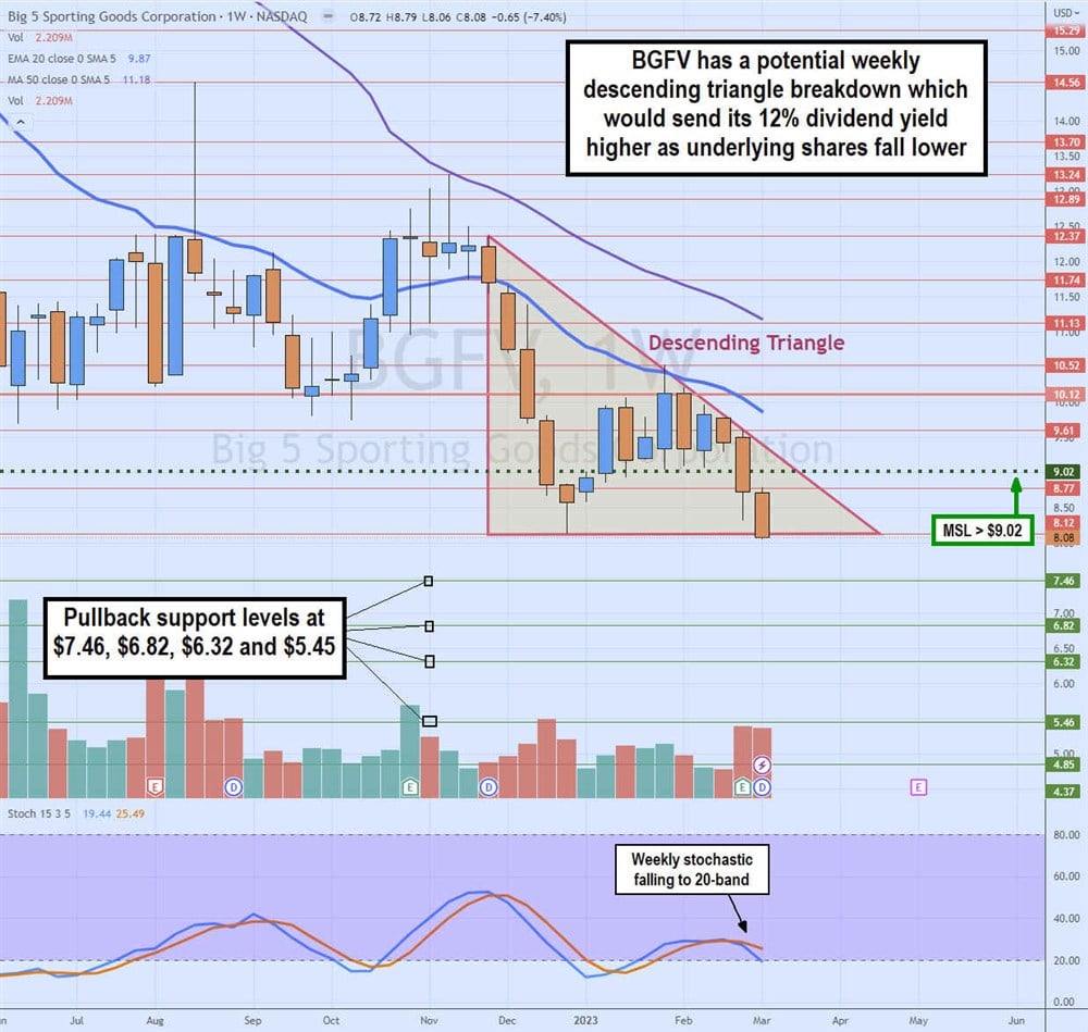 This weekly descending triangle commenced after peaking at $12.27 in November 2022. BGFV fell for the next four weeks, reaching a low of $8.08. It triggered a weekly market structure low (MSL) bounce through $9.02 to peak at $10.52 in January 2023.