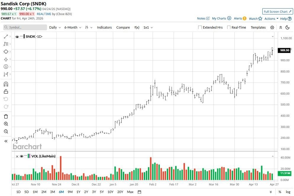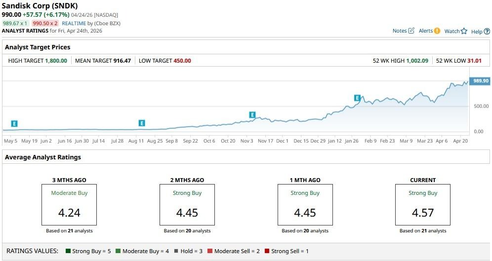 According to Barchart, the consensus rating on SNDK stock sits at “Strong Buy” currently, with price targets as high as $1,800, indicating potential upside of a remarkable 80% from here.