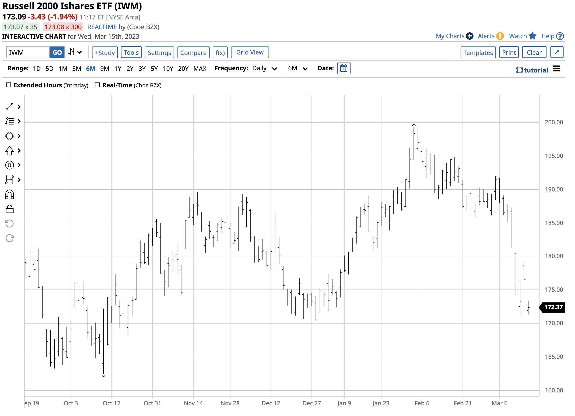 The short-term chart illustrates the 14.1% decline from $199.26 on February 2 to $171.07 on March 13. The Russell 2000 had been signaling danger for weeks before the SVB and other failures.