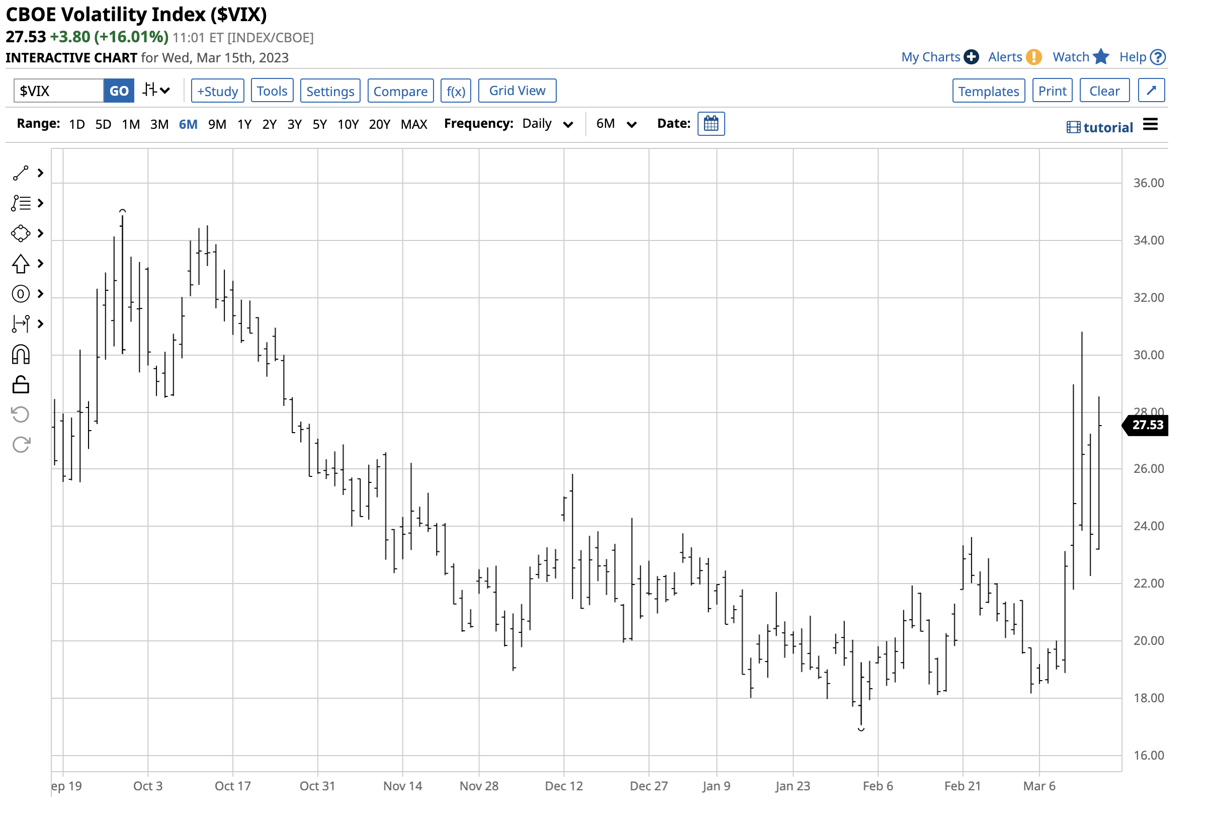 The chart shows The VIX index closed at 21.67 on December 30, 2022. A bounce in the stock market in early 2023 sent the VIX to a 17.06 low on February 2. On March 13, the index rose 30.81 as the impact of rate hikes hit the banking sector like a ton of bricks.