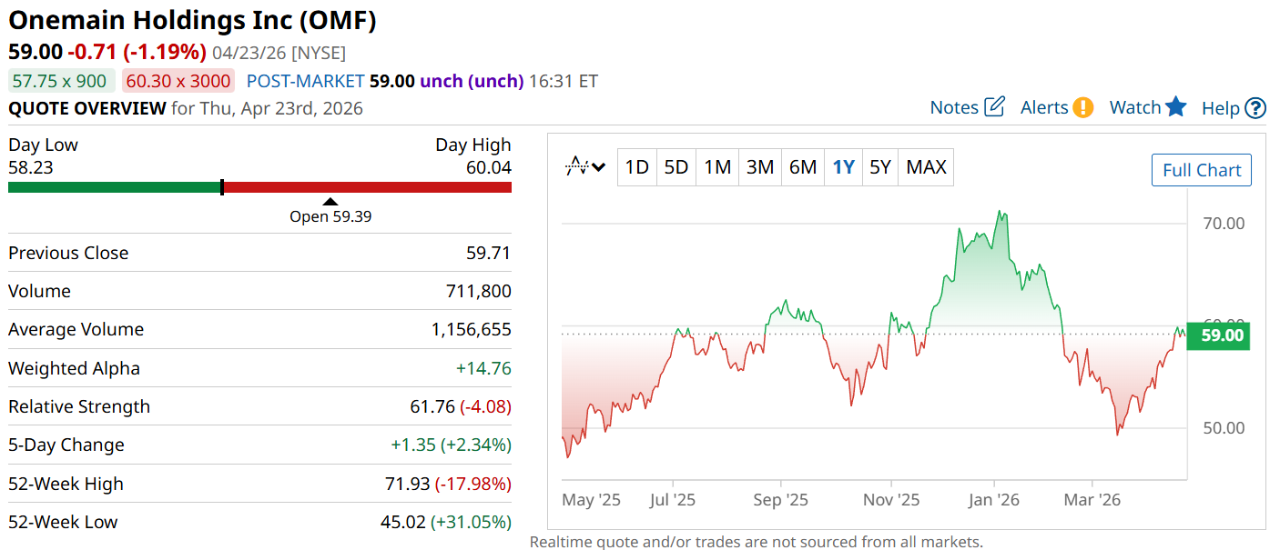 Going back, OneMain has a market cap of nearly $7 billion and pays a forward annual dividend of $4.20, translating to a yield of around 7%.