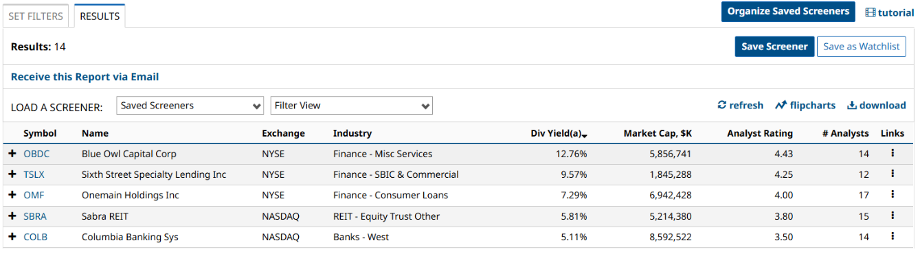 I set the screen, hit the results, and got 14 companies. I will cover the top three with the highest forward annual dividend yield.