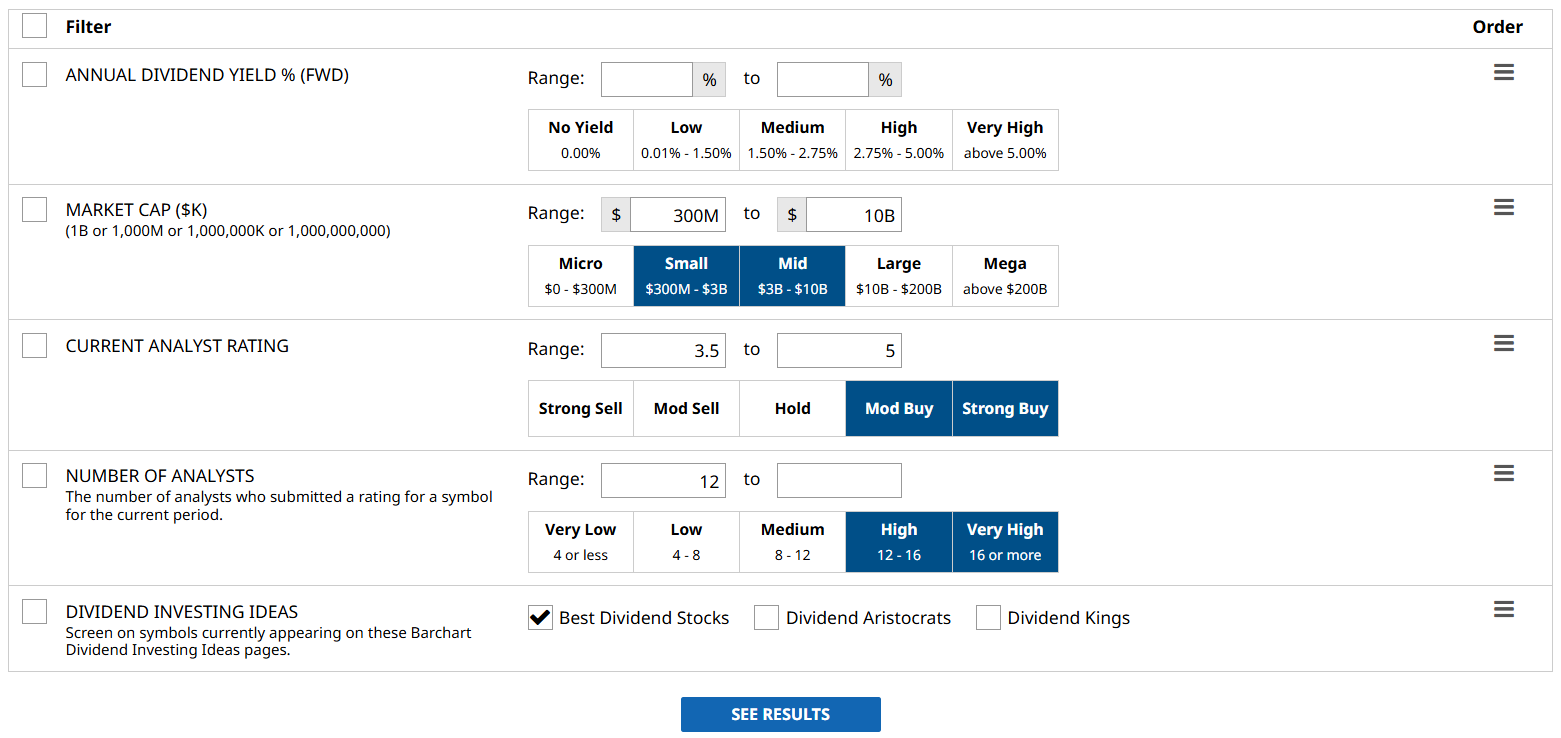 Using Barchart’s Stock Screener, I selected the following filters to get my list: