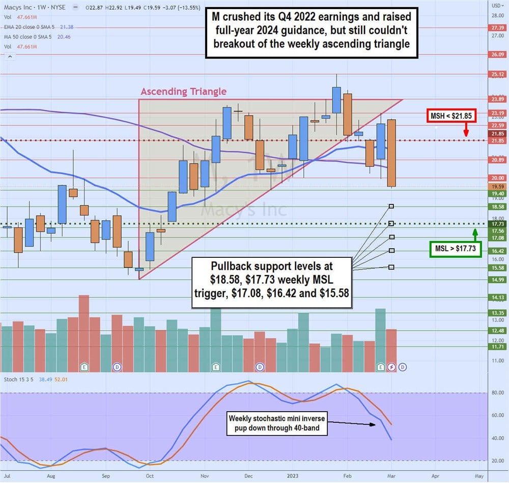 M appears to be breaking down. The weekly candlestick chart has an ascending triangle pattern comprised of a flat top and rising lows. Eventually, the stock should break out through the flat top trendline or below the diagonal rising lows trendline. The weekly ascending triangle commenced after bottoming at $14.99 in September 2022. Shares triggered the weekly market structure low (MSL) breakout through $17.73 to double top near $23.89, forming the flat upper trendline.