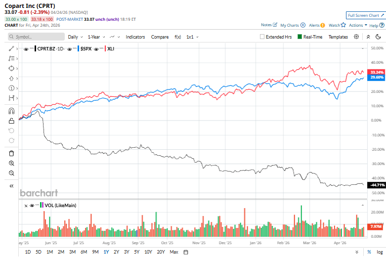 Copart has dipped 46.6% over the past 52 weeks, significantly lagging behind both the S&P 500 Index's ($SPX) 30.6% return and the State Street Industrial Select Sector SPDR Fund’s (XLI) 33.7% uptick over the same time period.
