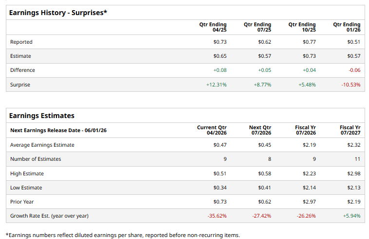 CPB is expected to announce its fiscal Q3 2026 earnings results shortly. Ahead of this event, analysts expect Campbell to report adjusted earnings of $0.47 per share, a 35.6% decline from $0.73 per share in the year-ago quarter. Moreover, the company has surpassed Wall Street's earnings estimates in three of the last four quarters, while missing on another occasion.