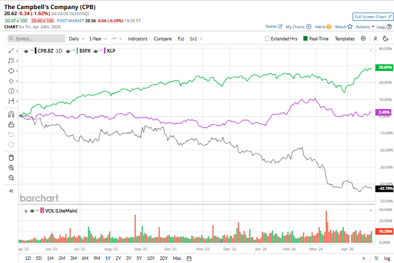 CPB stock has declined 43.9% over the past 52 weeks, considerably trailing both the S&P 500 Index's ($SPX) 30.6% surge and the Consumer Staples Select Sector SPDR Fund’s (XLP) 2.7% return over the same period.
