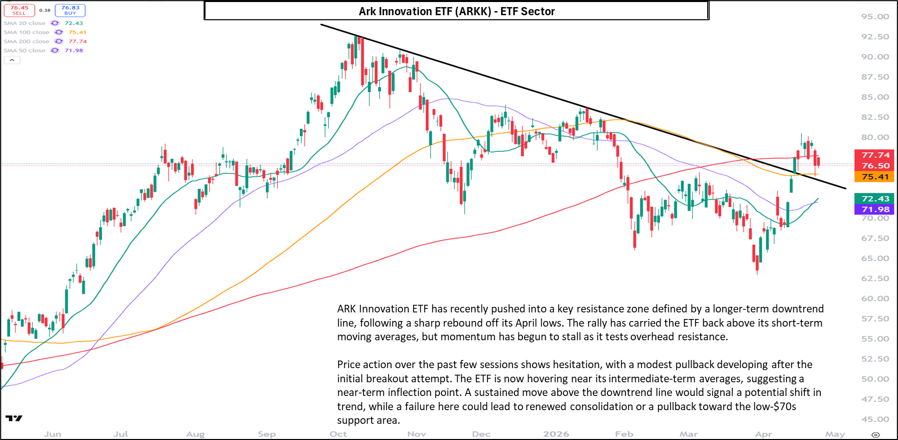 The ARK Innovation ETF presents a different—but equally instructive—setup. After a sharp rebound from its April lows, ARKK has returned to a longer-term downtrend line. This area is acting as resistance, and recent price action suggests hesitation. The ETF is now sitting near its intermediate-term averages, creating a potential inflection point: