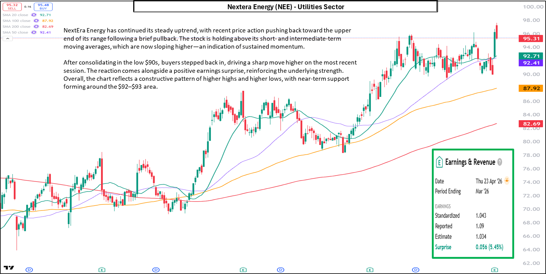NextEra Energy continues to reflect the type of price action the watch list is built to capture. The stock has maintained a steady uptrend, with price holding above both short- and intermediate-term moving averages. Recent action shows a push back toward the upper end of its range following a brief pullback, reinforcing the underlying strength. What stands out is the consistency: