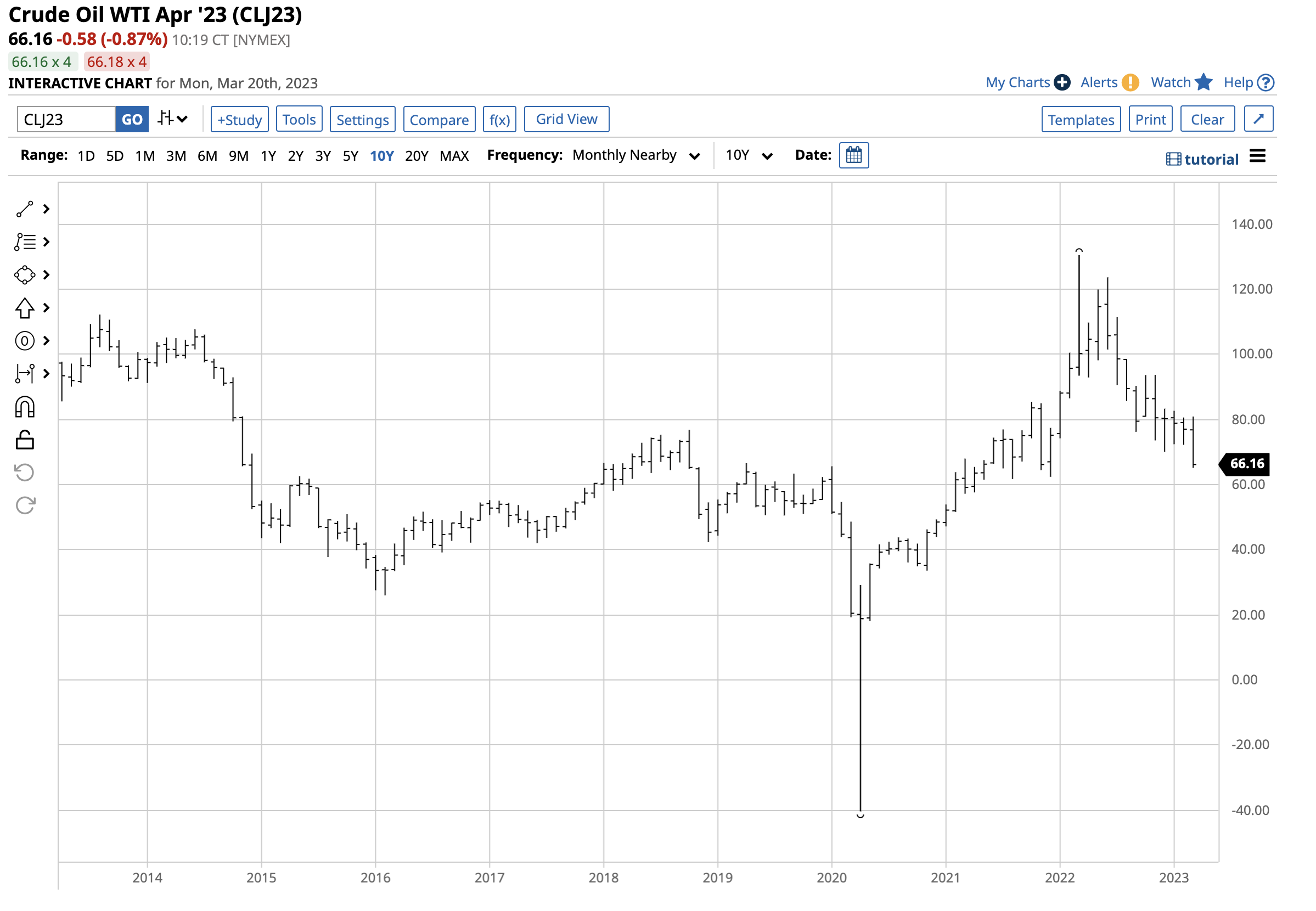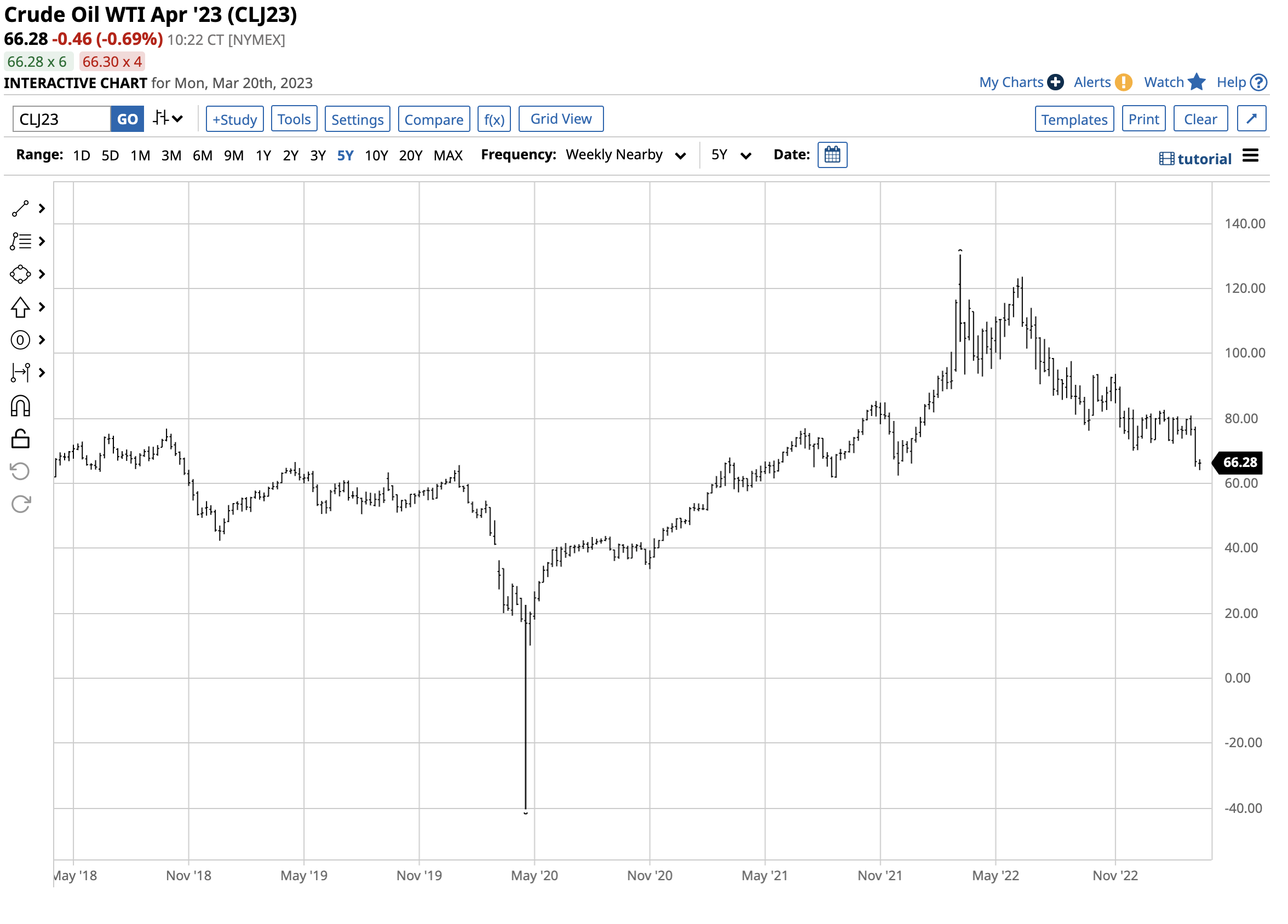 On March 15, 2023, the nearby NYMEX crude oil futures contract fell through the December 2022 $70.08 low and technical support level.