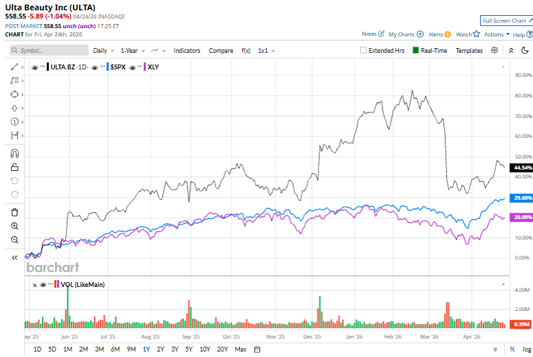 Shares of Ulta Beauty have surged 44.7% over the past 52 weeks, outpacing both the S&P 500 Index's ($SPX) 30.6% gain and the State Street Consumer Discretionary Select Sector SPDR ETF's (XLY) 22.3% return over the period.