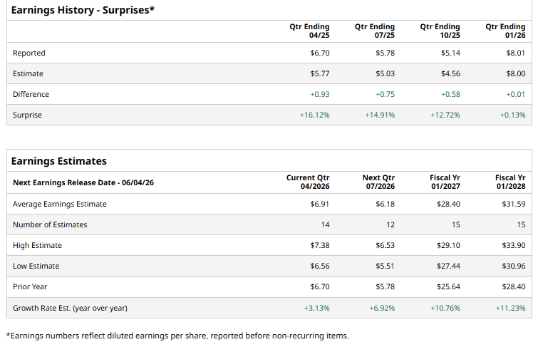 The beauty retail giant is set to announce its fiscal Q1 2027 results soon. Ahead of this event, analysts expect ULTA to report an adjusted EPS of $6.91, up 3.1% from $6.70 in the year-ago quarter. However, it has surpassed Wall Street's earnings estimates in the last four quarters.