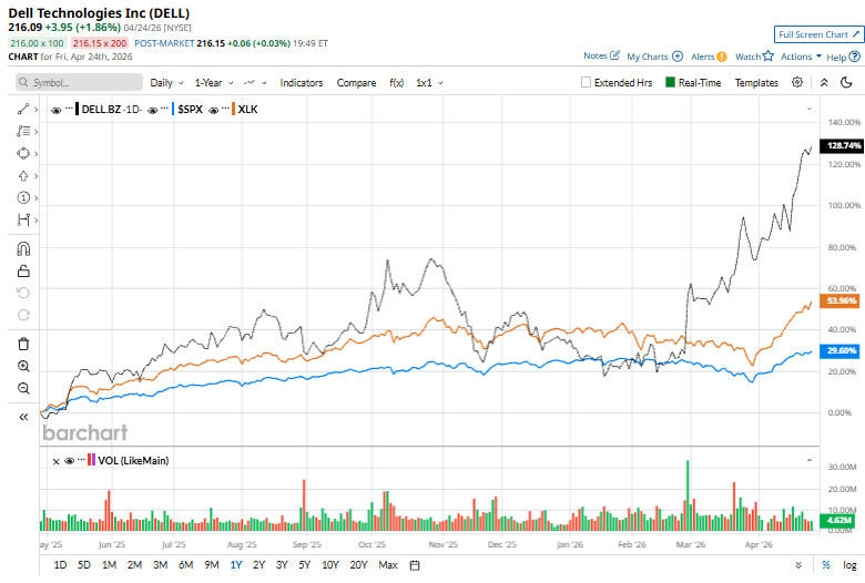 Shares of Dell Technologies have soared 128.9% over the past 52 weeks, outpacing the broader S&P 500 Index's ($SPX) 30.6% rise and the State Street Technology Select Sector SPDR ETF's (XLK) 56% return over the same period.