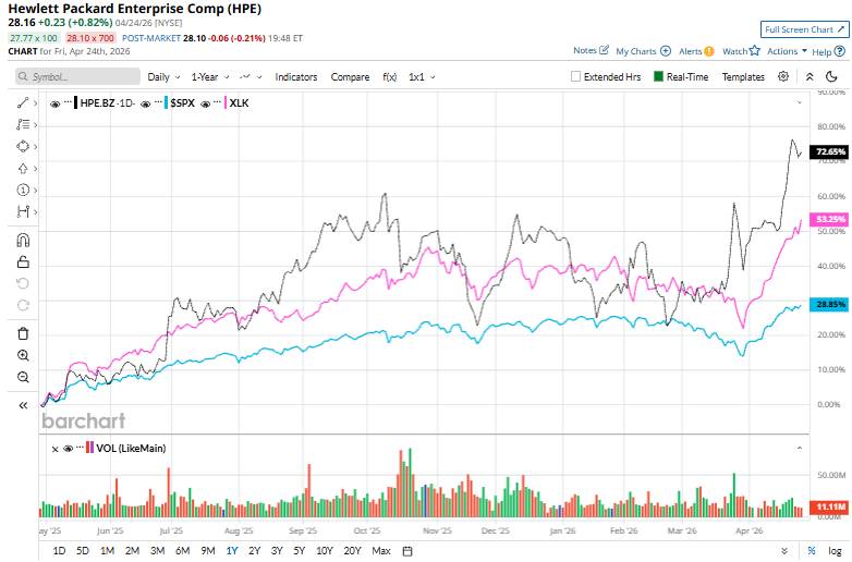 HPE stock has skyrocketed 74% over the past 52 weeks, outperforming the S&P 500 Index’s ($SPX) 30.6% rise and the State Street Technology Select Sector SPDR ETF’s (XLK) 56% return during the same time frame.