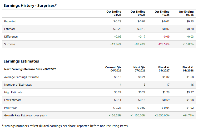 CRWD is expected to release its Q1 earnings soon. Ahead of this release, analysts expect the cybersecurity giant to report a profit of $0.13 per share, up 156.5% from a loss of $0.23 per share reported in the year-ago quarter. It has exceeded analysts' earnings estimates in three of the past four quarters, while missing on one occasion.