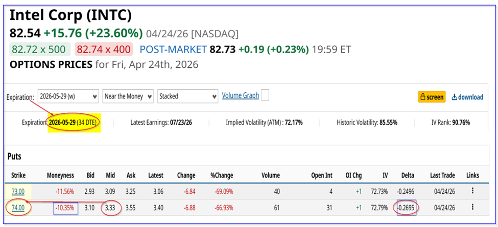 However, there's no guarantee INTC will reach this target price. After Friday's close, it may reverse. One way to play it, to set a lower price target, is to sell short out-of-the-money (OTM) put options.
