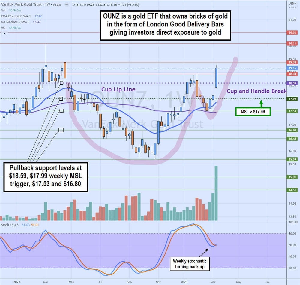 The candlestick chart on OUNZ illustrates the cup's formation and the lip line's rejection at $18.59 in January 2023. The pullback to $17.53 formed the handle as shares bounced through the market structure low (MSL) trigger at $17.99. OUNZ ripped through the cup lip line at $18.59 to trigger the cup and handle breakout. Pullback support levels are $18.59, $17.99 weekly MSL trigger, $17.53, and $16.80.