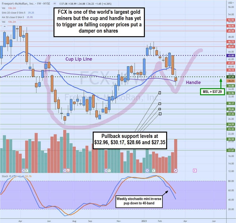 Like the OUNZ weekly chart, FCX formed a cup lip line and completed the cup formation as shares peaked at $46.73 in January 2023. Shares have since fallen back under the lip line at $43.00. It attempted to breakout through the lip line when gold prices initially spiked during the regional banking crisis, but shares rejected back under the cup lip lines through the weekly market structure low (MSL) buy trigger at $37.29.