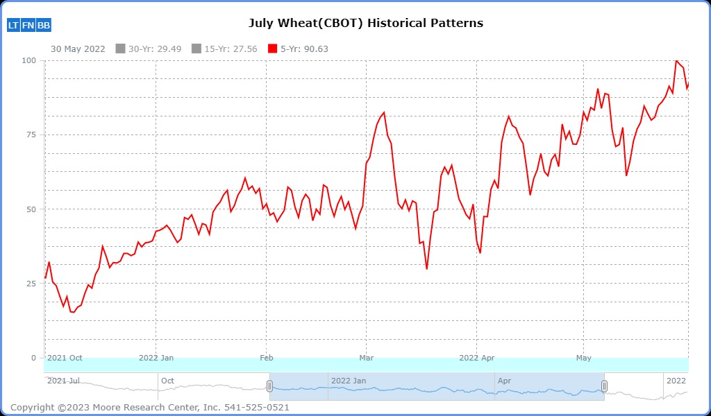 MRCI illustrates a 5-year seasonal pattern that wheat has followed closely since December. Typically, a 15-year seasonal pattern would be referenced, but the current market has followed the 5-year pattern more consistently.Â
