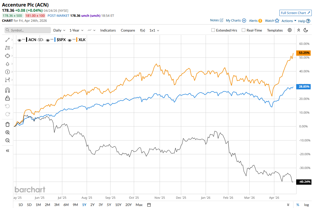 ACN stock has declined 38.8% over the past 52 weeks, underperforming the S&P 500 Index’s ($SPX) 30.6% rise and the State Street Technology Select Sector SPDR ETF’s (XLK) 56% rise during the same time frame.